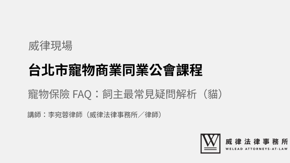 感謝台北市寵物商業同業公會邀請,本所李宛蓉律師擔任 2025 年「人寵關係先修課程」系列講師,與飼主們分享關於貓咪寵物保險的重點。