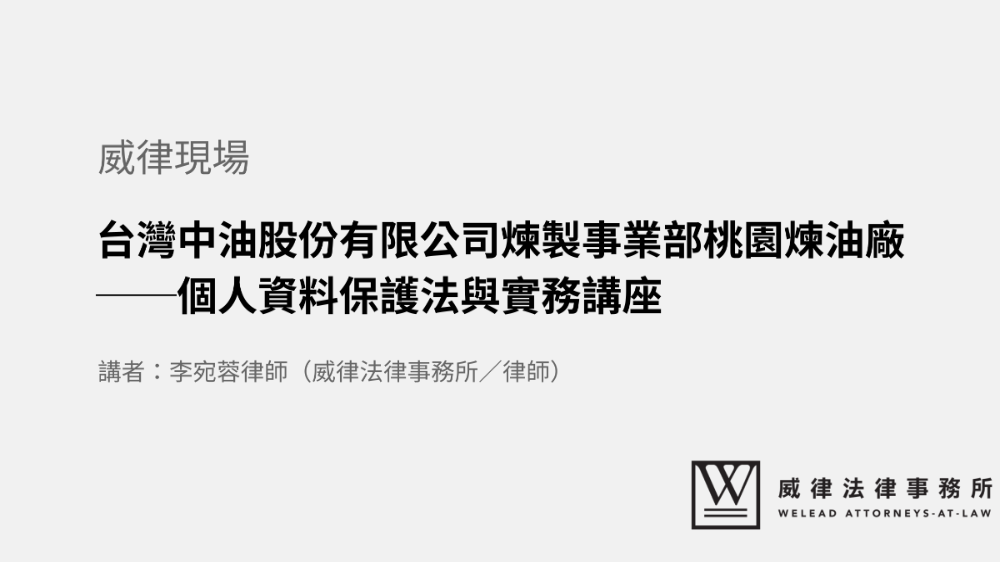 感謝台灣中油股份有限公司煉製事業部桃園煉油廠邀請本所李宛蓉律師至廠區演講。本次講座以個人資料保護法為主題,律師以基礎理論結合實務案例,與大家分享保護個資的重要性。