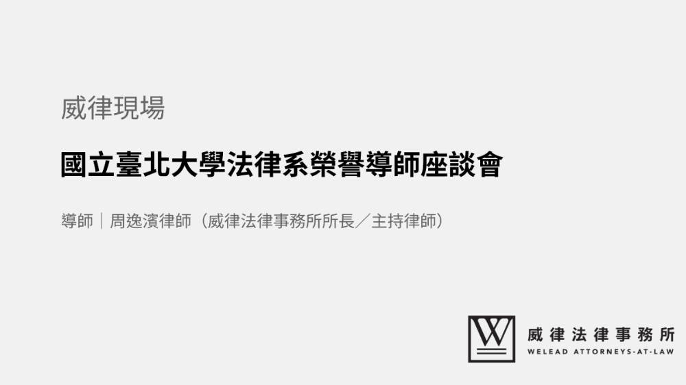本所所長周逸濱律師很榮幸可以擔任國立臺北大學法律系榮譽導師。本次生涯規劃座談會,除了安排同學們參訪威律外,周律師也分享了現今律師產業所面臨的危機與轉機,帶領大家了解娛樂法律師的真實日常。