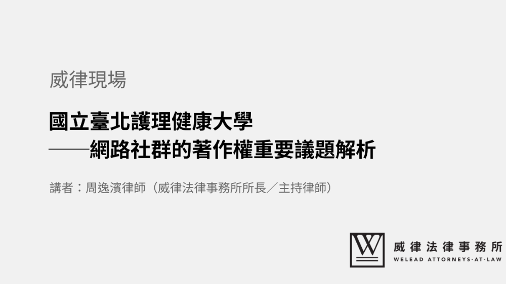 感謝國立臺北護理健康大學邀請本所所長周逸濱律師擔任講師,與大家解析在網路社群經營常見爭議。