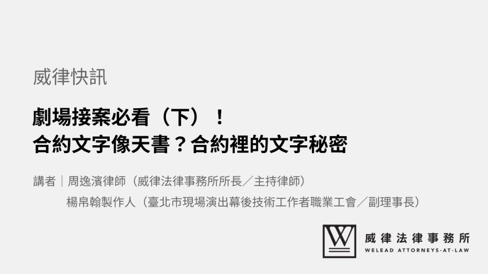 臺北市現場演出幕後技術工作者職業工會與榮耀基金會共同策劃,邀請本所所長周逸濱律師與臺北市現場演出幕後技術工作者職業工會副理事長暨劇場楊帛翰製作人進行對談。