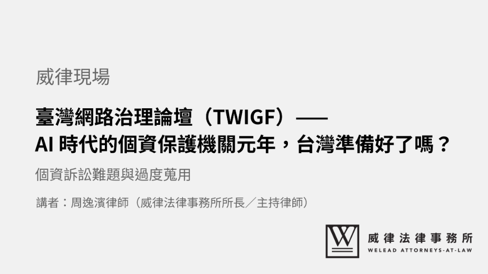 本所所長周逸濱律師以財團法人中華民國消費者文教基金會(下稱「消基會」)義務律師團的身份出席臺灣網路治理論壇(TWIGF),與各領域專家共同探討 AI 時代的個人資料保護課題。