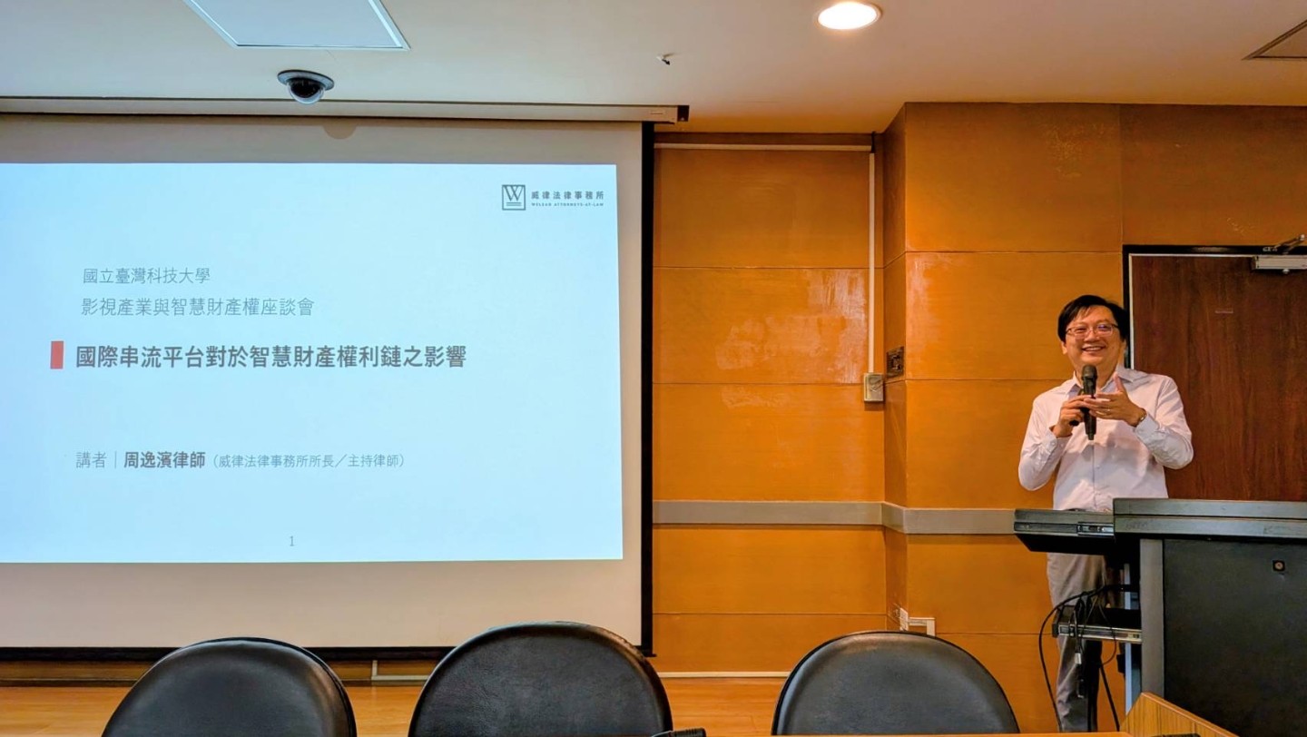 感謝國立台灣科技大學專利研究所邀請本所所長周逸濱律師擔任與談嘉賓,於座談會中與大家分享,國際串流平台對於智慧財產權利鍊的影響。