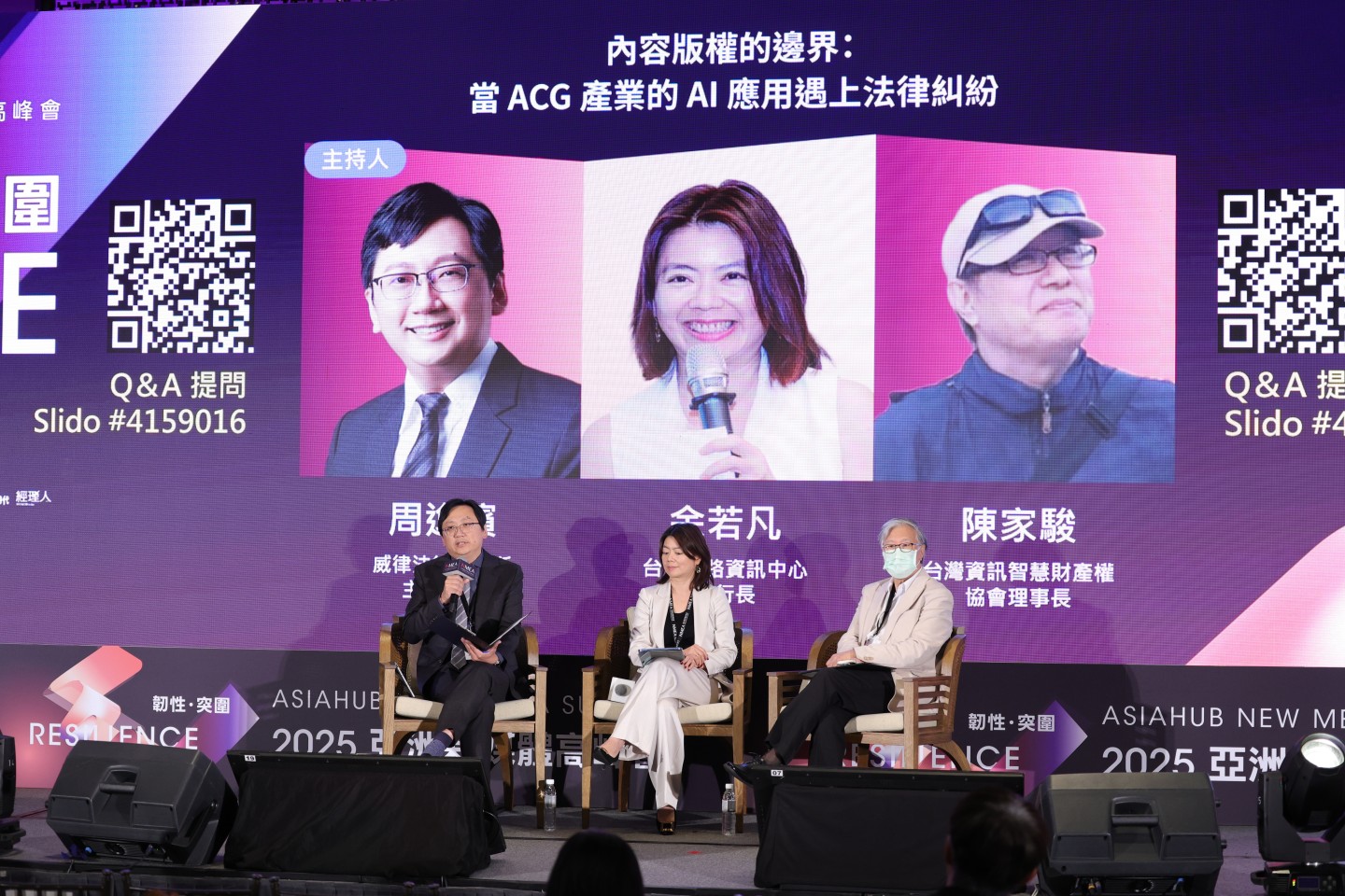 本所所長周律師很榮幸能在其中一場主題講座擔任主持人,與余若凡執行長、陳家駿理事長,共同從過去實務經驗,以法律與產業角度出發,與聽眾分享生成式 AI 對 ACG 產業所帶來的挑戰與觀察。