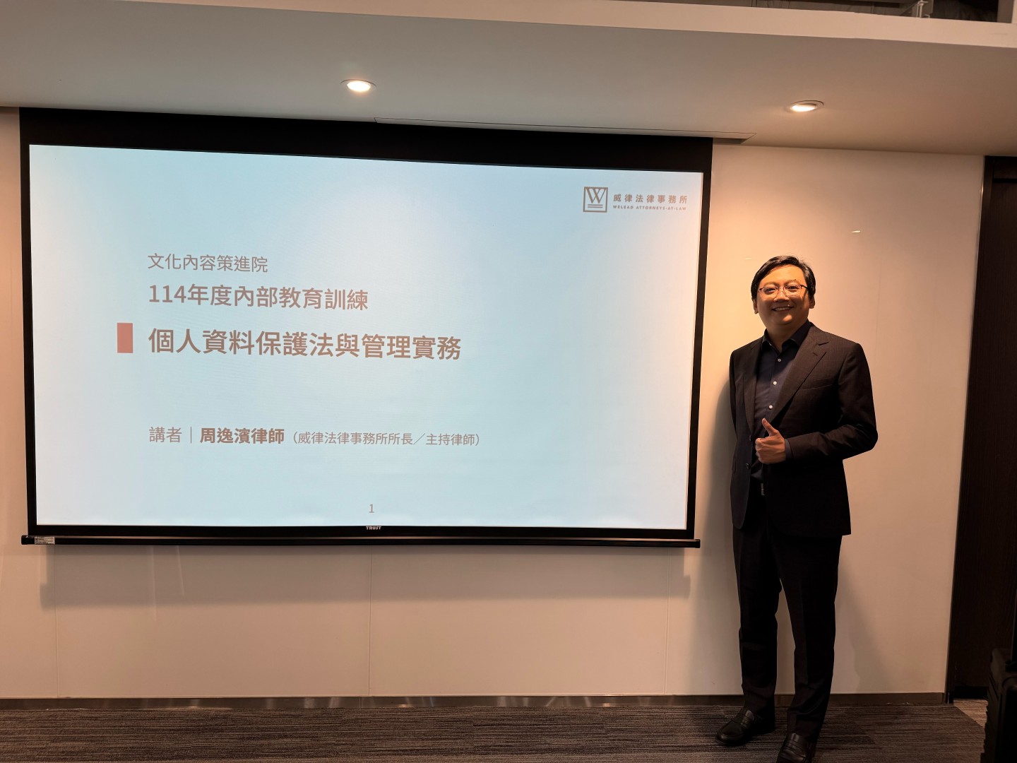 感謝文化內容策進院邀請本所所長周逸濱律師擔任 114 年度內部教育訓練講師,與同仁們分享個人資料保護法的關鍵議題 。